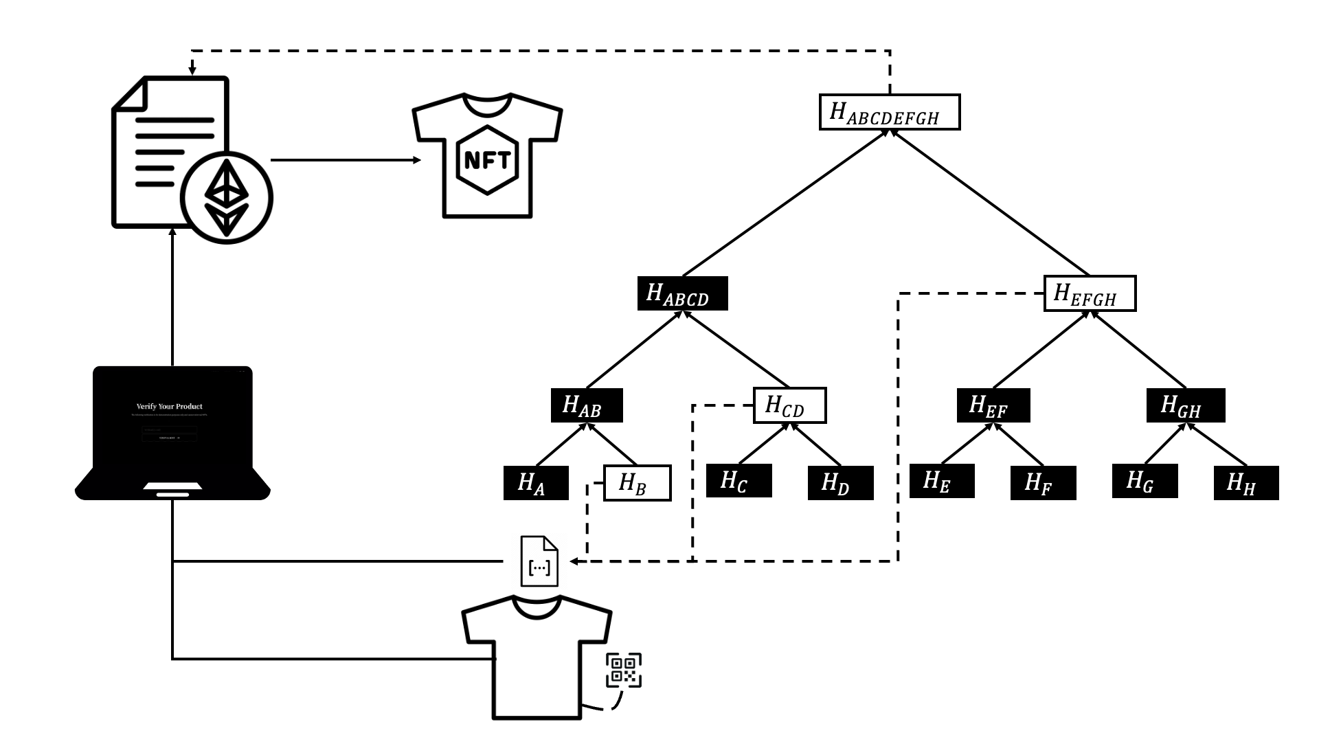 商品情報をチェーン上に記録するためにマークルツリー検証を採用しています。マークルツリーのルートは、ブランドのスマートコントラクトに事前に保存されています。検証プロセス中に、システムはまずユーザーの検証コードをハッシュ処理し、マークルツリーの葉ノードを生成し、次に対応するマークルツリー証明配列を計算します。これらのデータはスマートコントラクトにパラメータとして入力され、検証プロセスを完了し、検証の正確性と不可変性を保証します。